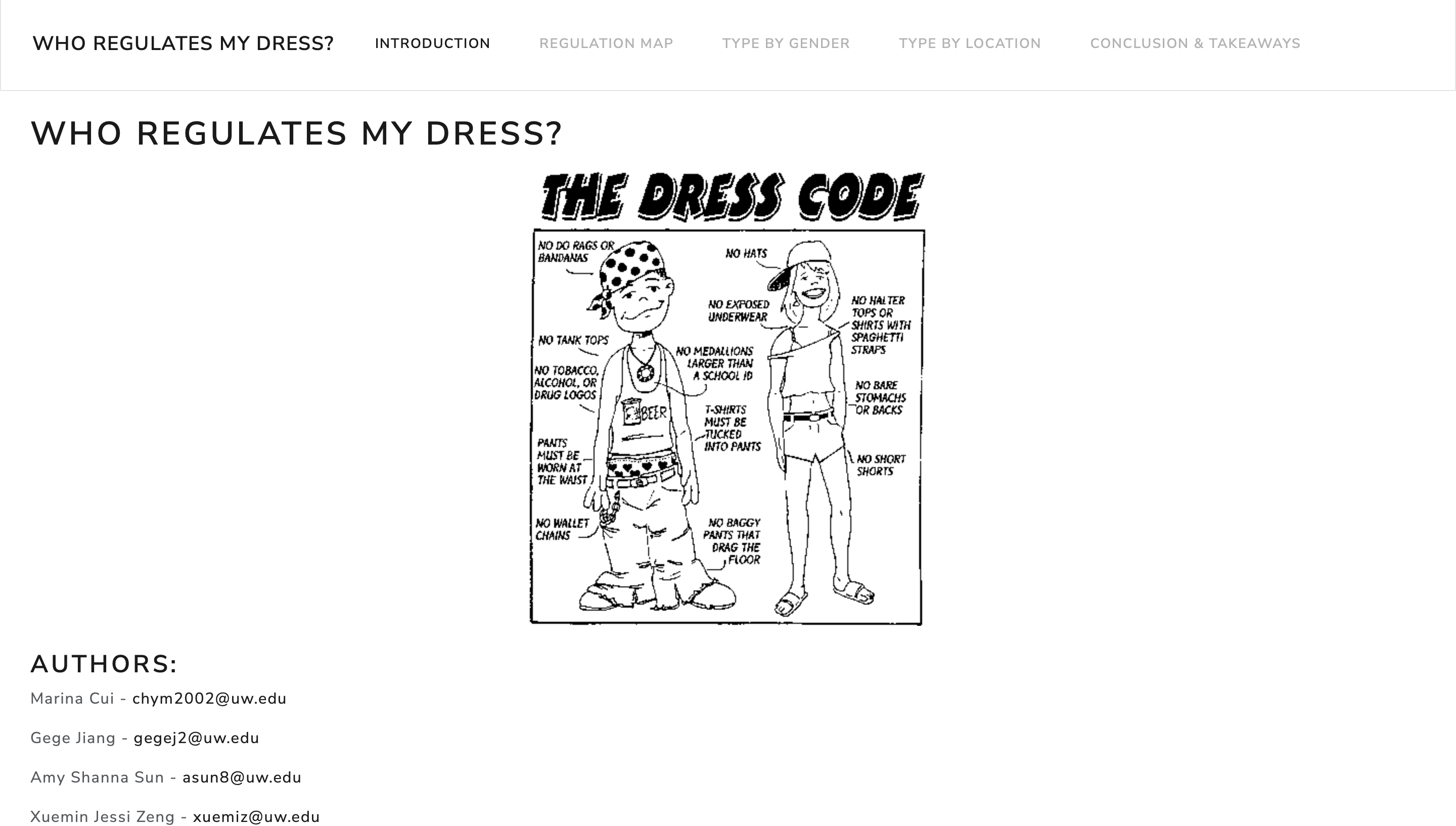 This data analysis addresses how different genders are being treated differently in regards to school dress code policies. This is an important question to explore as school policies and education to some extent shaped the value of high school kids on sexualization, and how they see their bodies. We are concerned that these regulations may create gender stereotypes , because with the implementation of these policies, at best, students receive the message that those body parts are bad, should be hidden, or are important to others. My job in this project was mainly developing the map section of the analysis.