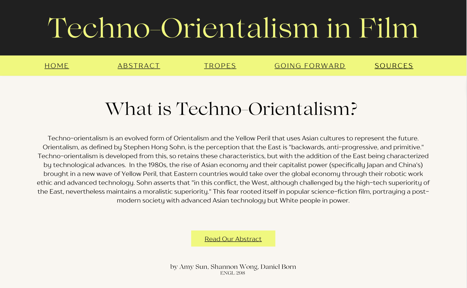 A short interactive website explaining the origins and implications of the phenomenom in film described as "techno-orientalism." Designed and executed on Canva. November 2022.
